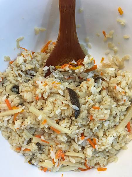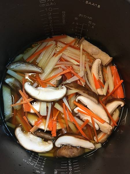 米和切好的竹筍、紅蘿蔔、香菇,加入[酒、醬油、味醂]放進電鍋一起煮