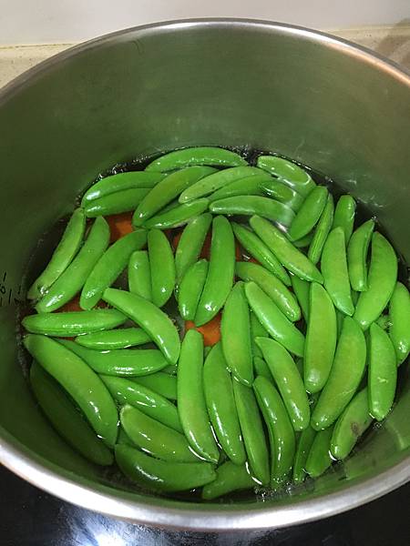 豌豆和切片的紅蘿蔔用加入少許鹽的水煮熟