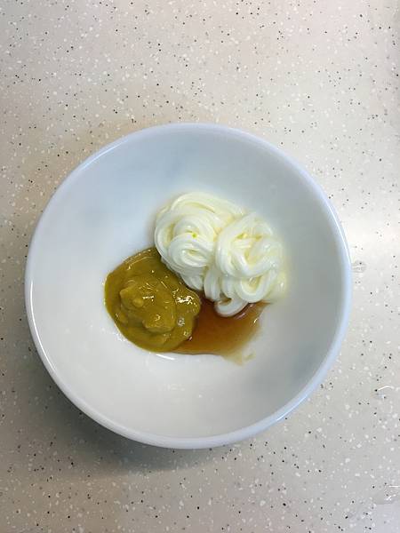 美乃滋4大匙、芥末2大匙、蜂蜜1小匙、黑胡椒少許混和做成醬料