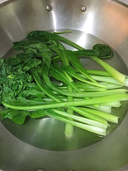 油菜放進加鹽的水燙過,燙好後放入冰水放涼,再取出將水擰乾