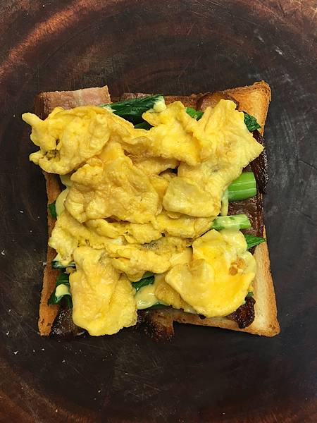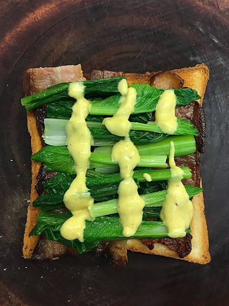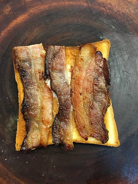 烤過的吐司塗上奶油放上培根