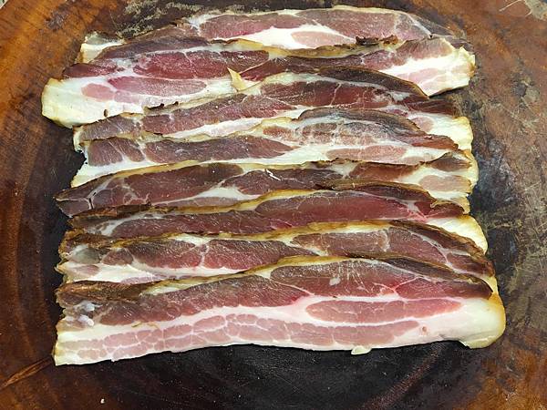 由於我的培根是自製的,嘗起來會有市售培根沒有的煙燻味,切得稍微厚一點,吃起來更有分量