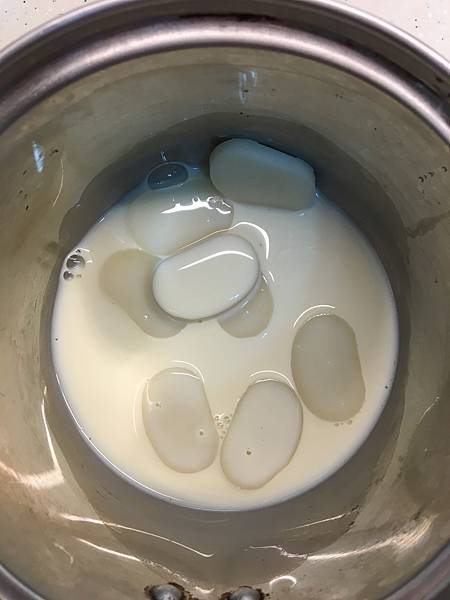 鍋中放進年糕塊和無糖豆漿煮至濃稠,最後再用黑胡椒和鹽調味