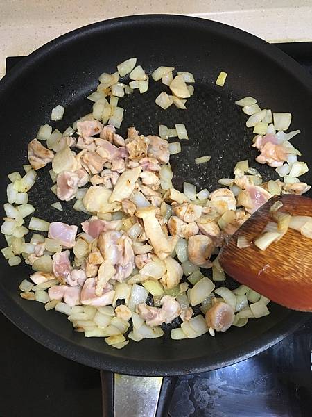 洋蔥、雞肉、蝦子切丁用奶油炒過