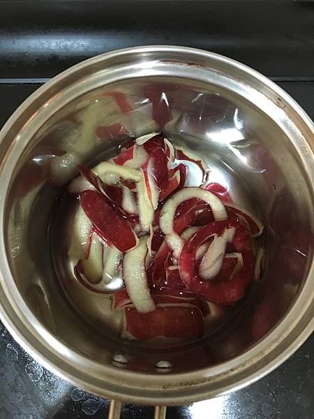 削下來的蘋果皮煮出紅色汁液,熄火加入玫瑰花增添顏色和香氣