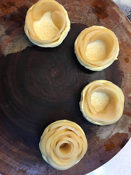 塔皮底部用叉子戳洞放進切薄的蘋果片,依圖的順時針方向層層做成玫瑰花,完成後放進烤箱烤