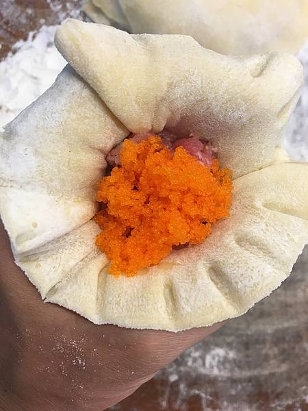 先放上肉餡(豬絞肉、蔥末、鹽、胡椒充分攪拌均勻),然後加上魚卵再放一層肉餡,最後用虎口捏緊成型