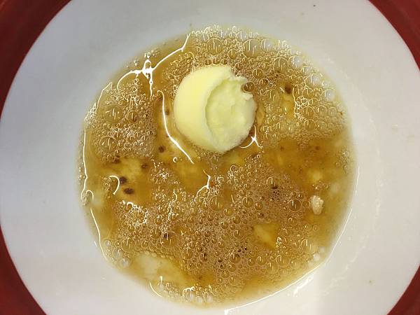 蛋白、黑糖、過篩的低筋麵粉、無鹽奶油拌勻。