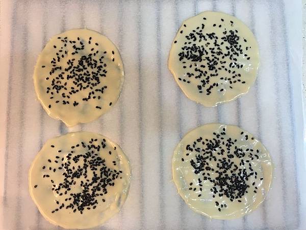 將麵糊鋪平於烤盤上,撒上少許黑芝麻,進烤箱烤至微黃酥脆。
