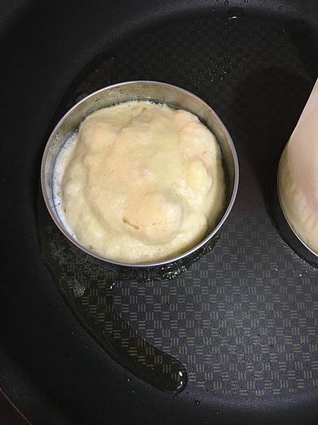 平底鍋加熱放入奶油,麵糊倒進平底鍋中的模具烘煎
