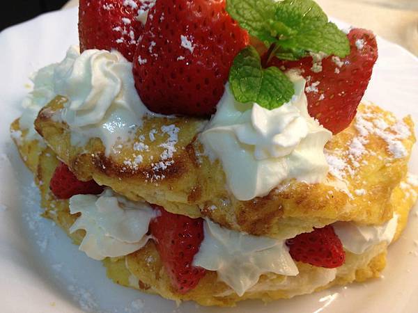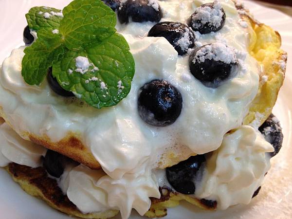新鮮的莓果很好吃,配上襯托的薄荷葉色彩更鮮豔,只可惜鬆餅沒做那麼高,口感就略遜一籌,沒加優格的舒芙蕾香氣也比較濃膩
