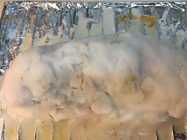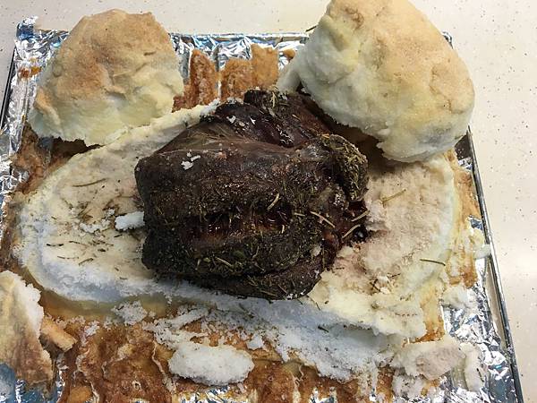 用粗鹽泥包覆鹿肉放進烤箱烤