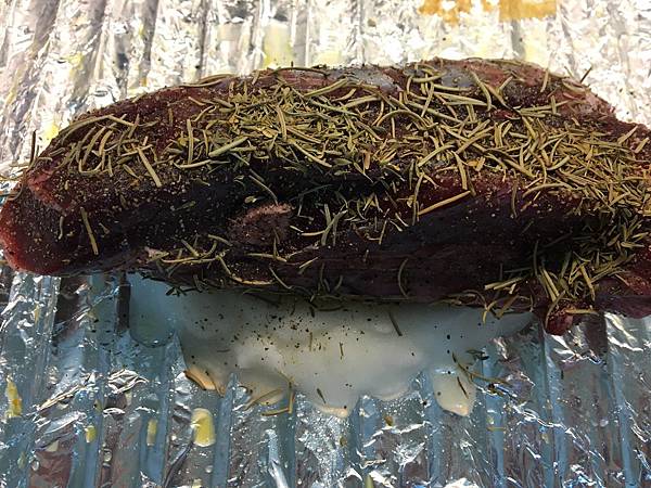 鹿肉表面塗抹黑胡椒、迷迭香、百里香