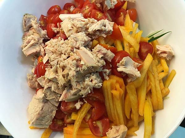 硬柿切絲加入鮪魚罐頭,所有食材混和均勻
