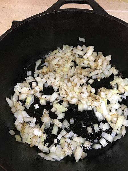 芥末籽1/2大匙放入油鍋中加熱,開始彈跳後放入小茴香1/2大匙,小茴香冒出小油泡時加入切碎的洋蔥