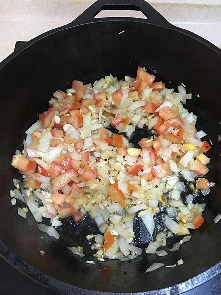 洋蔥炒軟後加入1大匙薑末、1大匙蒜末炒香再加入番茄碎