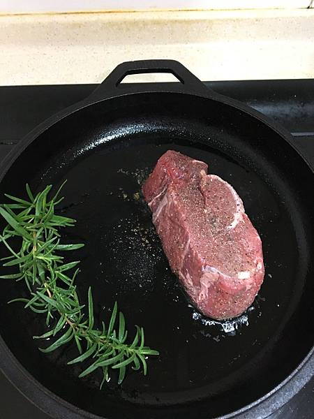 菲力牛排撒上胡椒 、鹽,鍋中倒入橄欖油放入迷迭香,菲力牛排下鍋將表面煎熟